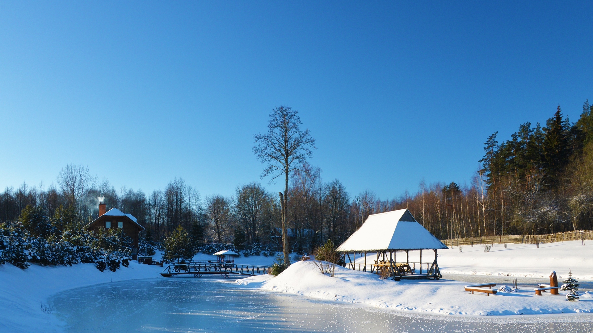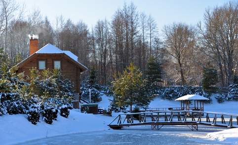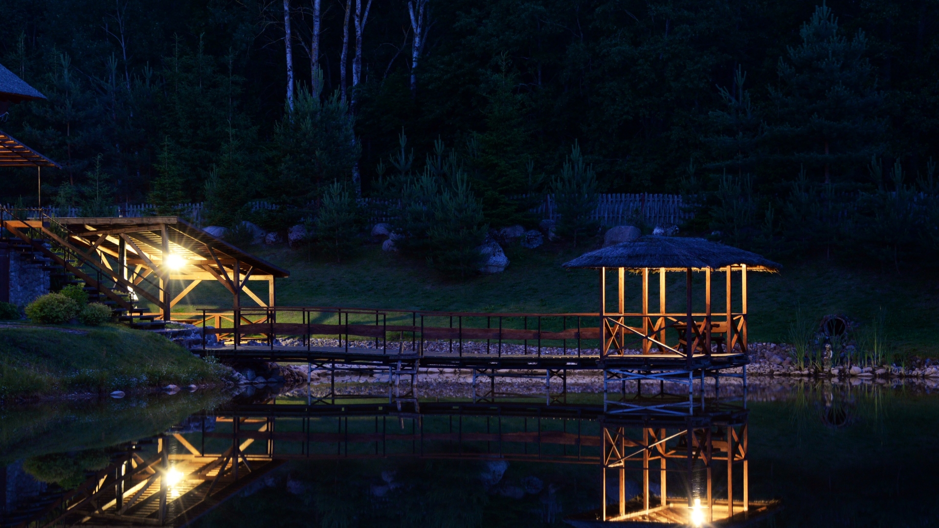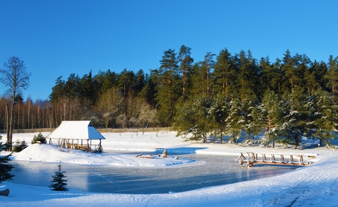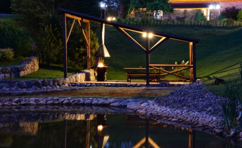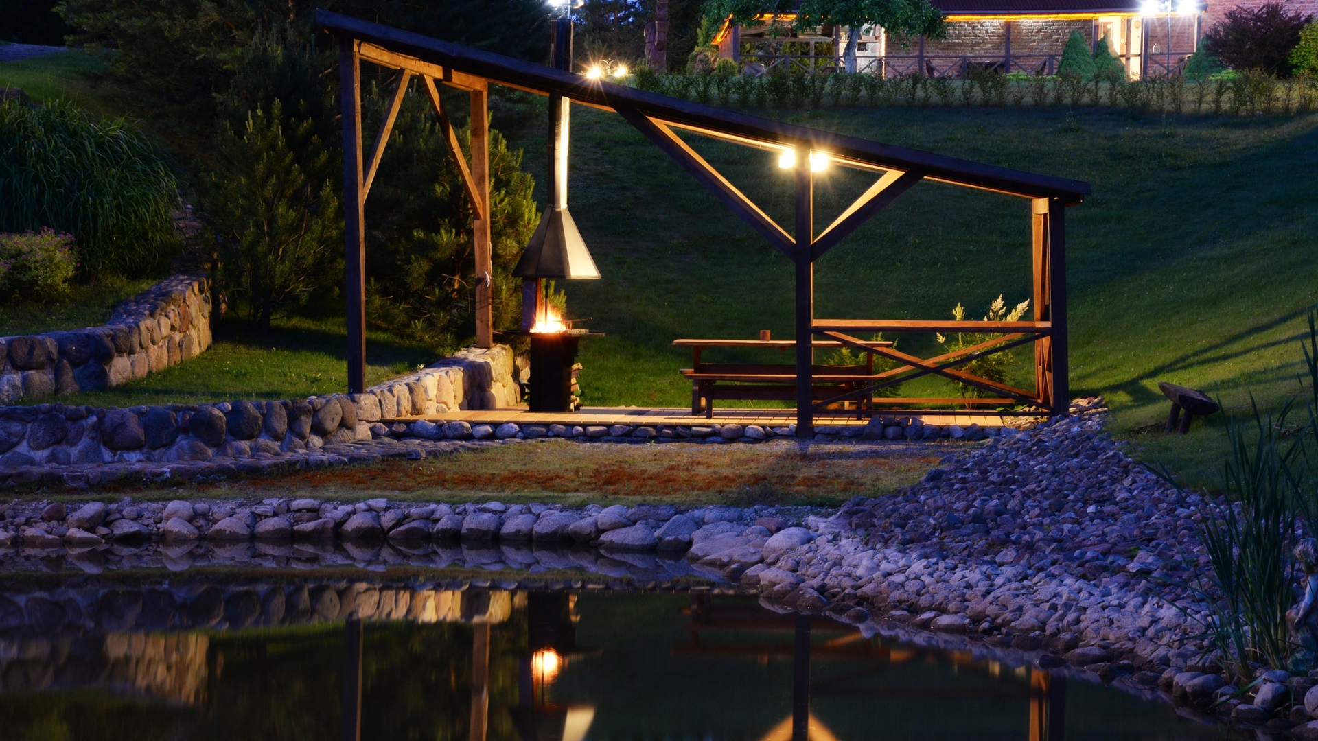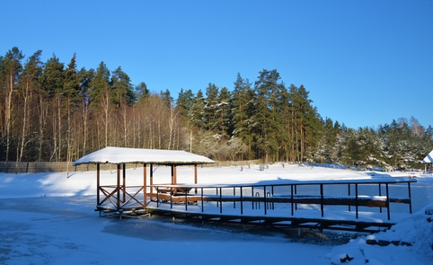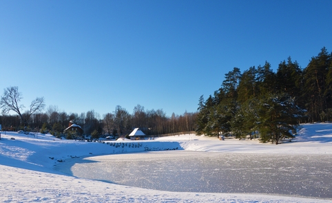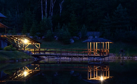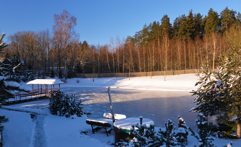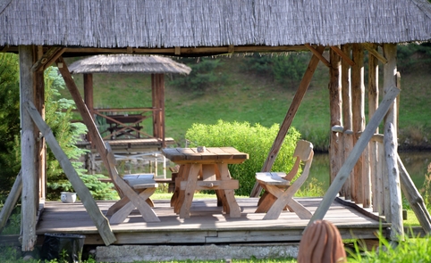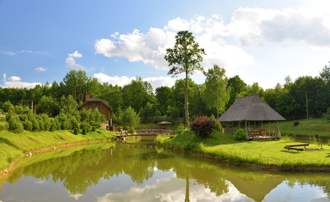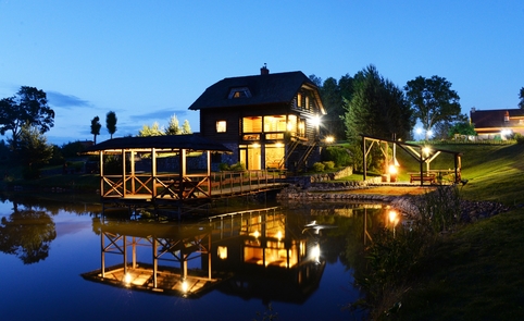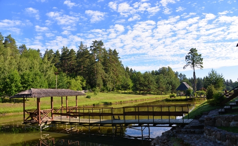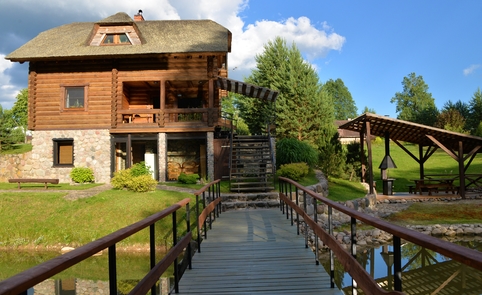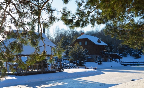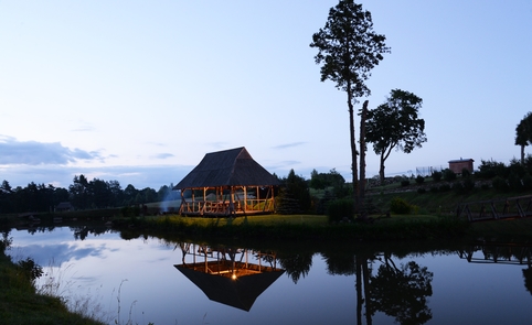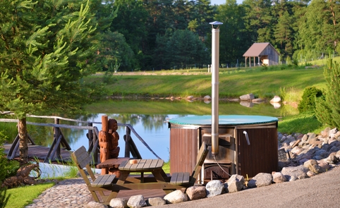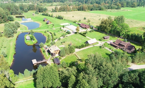 Ant pirmo, 0,5 ha ploto, tvenkinio kranto stovi medinis 9 žm.poilsiui skirtas pastatas. Čia 22 kv. m svetainė, minivirtuvėlė, WC, du dušai, garinė pirtis, o antrame aukšte tys dviviečiai ir vienas trivietis miegamieji kambariai (max. 2 + 1, 2 + 2, 2 + 1, 2 + 2 + 1) su atskirais WC. Iš pastato nuostabus vaizdas į vandens telkinius ir prasidedantį Šventosios kraštovaizdžio draustinį, šalia pastato kubilas, pavėsinė su stacionariu griliumi. Pirmo tvenkinio viduryje sala su pavėsine.