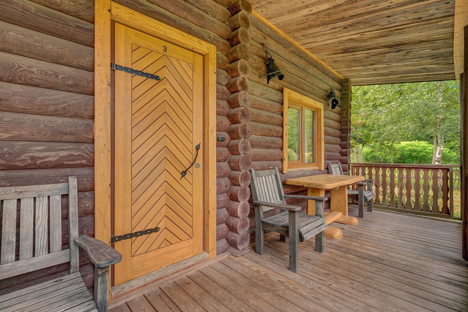 Komfortiškuose rąstiniuose nameliuose prie upės su židiniais, lauko terasomis, kambariuose, kempinge.